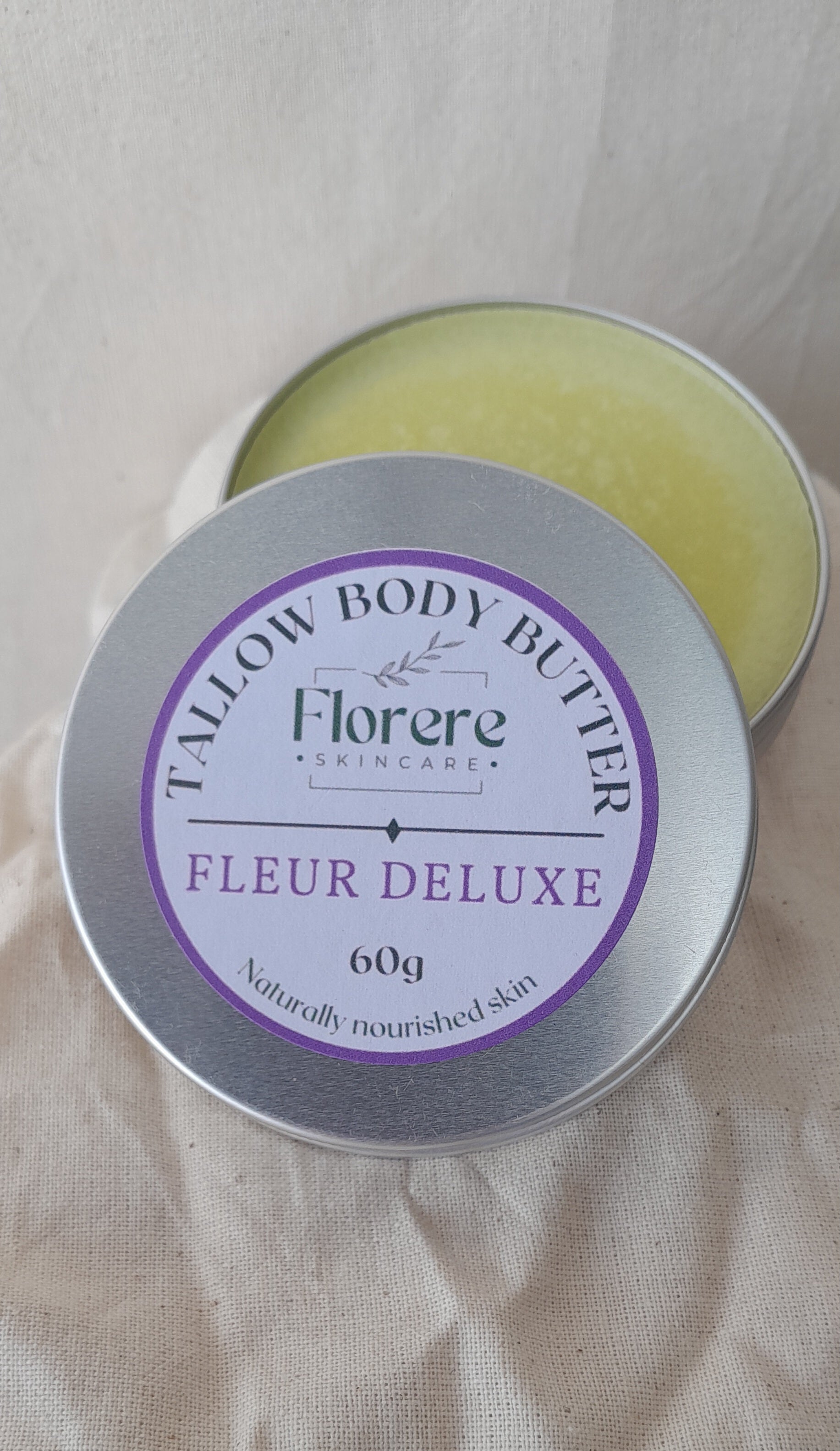 Elevate your skincare ritual with our Fleur Deluxe Tallow Body Butter, a fusion of nutrient-rich tallow and botanical-infused avocado oil, exquisitely scented with our signature essential oil blend. This sumptuous formula immerses your skin in deep hydration, effortlessly absorbing to nourish and restore vital moisture. Its luxurious texture supports the skin’s natural barrier repair, enhancing softness and refining texture for a smooth, radiant finish.